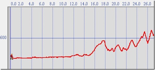 未舗装部分に入ると、赤い砂埃の道です。車やバイクが通り過ぎる前が一瞬見えなくなるぐらいの砂埃です。道は木陰とかなく炎天下なので正直、かなり暑くてきつかったです。道もアップダウンがあります。左折して7.5キロのところでTad Suaの入口の看板が、なんとなくここではないことはわかっていたので、そのまま直進、さらに2キロ進んだところで、Tad Vangong方面の看板があり、ここで右折して滝に向かってしまいました。帰宅後、チェックした感じだと、Tad Moun滝は、そのまま道なりにあと1キロぐらい進んだところだったような気がします。ただ、すでに10キロ近く走っていてバテバテ、右折してからもTad Vangong滝まで2キロもあり、滝についたときにはへばってしまいました。滝に到着したのはお昼少し前でした。下の写真は標高差グラフで行きは登り基調だけど結構アップダウンがあるのがわかると思います。