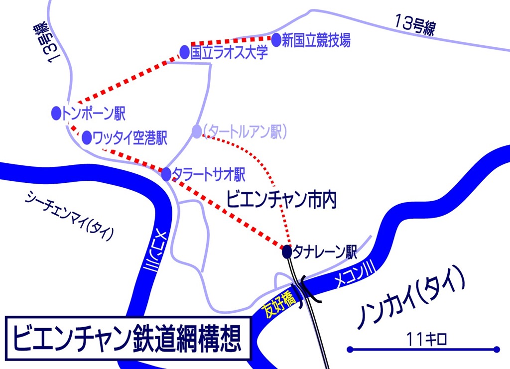 鉄道のニュースを投稿したので、次いでに参考まで。将来的にはタナレーン駅からビエンチャン市内まで鉄道を運行したいみたいです。(当然ですよね。)次のような構想があるみたいです。以前は、タートルアンの裏手に駅を建設したい、といった話だったと思うのですが、最近は、もう少し実用的なタラートサオ、ワッタイ国際空港、トンポーンからドンドック地区にある国立ラオス大学、そしてSEAゲーム開催予定で新国立競技場といったルートが考えられているようです。