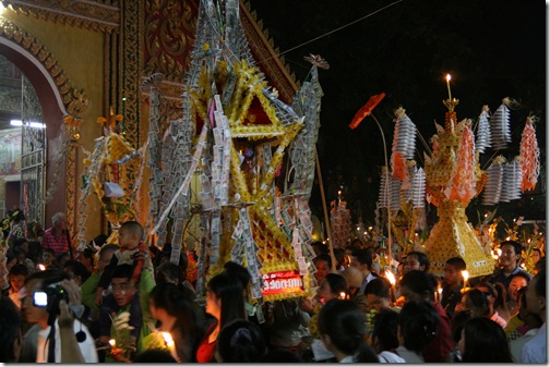 さて、どんな感じだったかというと、夕食をナンプ近くの「アンポーン」という新しく出来たお洒落なラオス料理のレストランで食事をしていたのですが、すでに19時前ぐらいから、このお店の前の家族がウィエンティアンに行く出発の準備に入って、記念写真を撮ったり、ドラを叩いたり、あるいは掛声をみんなで掛け合っています。もしかしたら20時って書いてあったけど19時から?とちょっとドキドキしながら、ワットオントゥに19時過ぎに向かいます。寺院にはお祭りの屋台が出ていたりして楽しい雰囲気。寺の本堂を囲むようにゴザがしかれ奉納するパサートプンが置かれ、信者がスタンバイしています。この間にもどんどん「パサートプン」が運び込まれてきます。19時45分、僧侶がワットオントゥの本堂を出発、隣にあるワットインペンまでロウソク、花、線香を持って進みます。その後ろに信者の人たちが続きます。ワットインペンとワットオントゥは通りを挟んで隣にある寺院で約300mの行進になります。