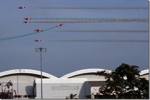ビエンチャンタイムスに詳細が書いてあったので少し補足。航空チームは、1996年に設立されたインド空軍のSurykakirianアエロバティックスというチームです。9機のKiran Mark-IIというインド空軍所属の飛行機です。パフォーマンスでは飛行速度は時速200-600Kmで地上30mでの低空飛行を見せてくれました。(マッハ0.5ぐらい) Kiran Mark-IIは、インドが独自に開発した並列複座配置のジェット訓練機だそうでインドのヒンダスタン社が独自開発したものだそうです。最大速度が780Kmで、6.25Gだそうですが、うーん、そう書いても今一つピンときませんね。