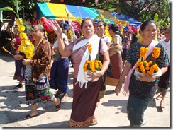 さて、ワットシームアンですが、19時過ぎに到着しましたが、すでにウィエンティアンは始まっています。欧米人の観光客も興味深く見学していました。20時を過ぎると「パサートプン」も大挙して運び込まれ、寺院の周りを3周して次々と寺院の本堂の中に奉納されていきます。