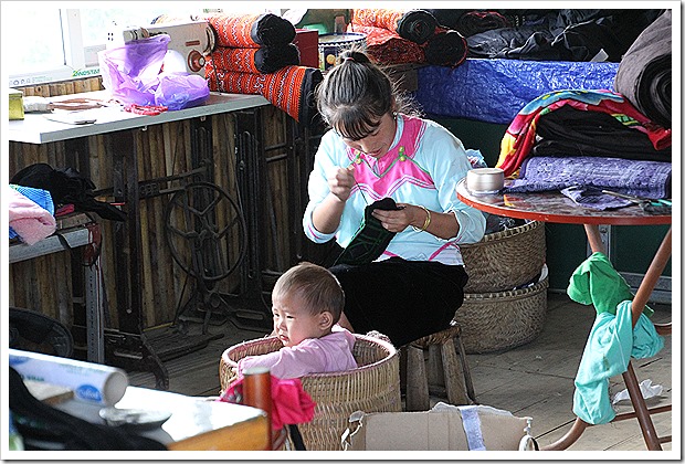 トレッキング開始から2時間、黒モン族の織物のお店に立ち寄りました。